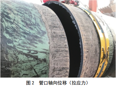 管口位移形式主要有徑向位移和軸向位移兩種。徑向位移即管道在切管斷開(kāi)后,兩道管口之間會(huì )發(fā)生上下左右各個(gè)方向的瞬間錯邊位移,如圖 1所示。軸向位移則根據管道在軸向上的受力有所不同,如管 道受拉應力,則切管中即將切斷時(shí),管體瞬間撕開(kāi)(圖 2);如管道受擠應力,則管道即將斷開(kāi)時(shí)兩道管口之間的距離變小,造成管口之間相互擠壓。由于管道所受應力復雜,斷管后管口位移情形差別也較大,管口應力聚集的巨大能量得到瞬間釋放,威脅人員及設備安全。