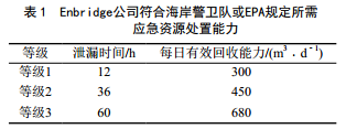 Enbridge公司6B管線(xiàn)破裂泄漏后,最先做出反應的是當地管道維護站的4名Enbridge雇員。他們沿著(zhù)Talmadge溪下游而不是開(kāi)裂點(diǎn)周邊區域做了補救工作,忘記了利用Talmadge溪邊的涵洞做底流壩來(lái)減少原油擴散,對于流速很快的河水反而使用了不合適的圍油欄。漏油處理承包商直到10多個(gè)小時(shí)后才確定漏油點(diǎn)。由于缺乏明確的應急資源要求, Enbridge公司自己詮釋了處理開(kāi)裂所需資源的量級,導致發(fā)現開(kāi)裂后最初幾小時(shí)內缺少足夠的資源和漏油處理回收設備。相比之下,海岸警衛隊和EPA法規都明確要求應急預案中滿(mǎn)足最糟情況的泄漏應急所需物資,且必須安置在能夠在應急預案所特定的時(shí)間內到達現場(chǎng)的位置。表1 為Enbridge公司應急資源處置能力。