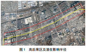 通過(guò)實(shí)地調研,該管段約4 km敷設在人行道下方,管道兩側200 m范圍內樓房、人口密集,住戶(hù)約11 000多戶(hù)、二級甲等綜合醫院1家、學(xué)校1所(約1 800名學(xué)生)、小規模幼兒園2所、雜貨市場(chǎng)1個(gè)、辦公大樓多幢,總人口約35 000~45 000人。根據GB 50251―2014《輸氣管道工程設計規范》的規定,該管段地區等級在設計施工階段因周邊建構筑物和人員較少,定為二級地區,現已升為四級地區。同時(shí),根據GB 32167―2015《油氣輸送管道完整性管理規范》規定,將該管段評定為III級高后果區管段,其潛在影響半徑為管道兩側200 m,如圖 1所示。