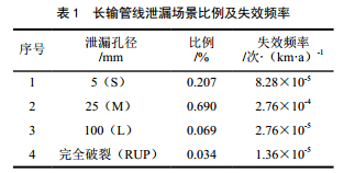 失效頻率的確定普遍采用同類(lèi)設備的歷史統計數據,經(jīng)數據來(lái)源及可靠性分析后,應用相關(guān)理論模型進(jìn)行事故發(fā)生概率計算,然后結合項目實(shí)際情況進(jìn)行修正采用。國外可供查閱的設備失效數據庫較多,而國內在這方面的數據積累相對較少。天然氣輸送管道的基礎失效頻率來(lái)自GB 32167―2015《油氣輸送管道完整性管理規范》附錄G推薦的輸氣管道泄漏頻率,其頻率為4×10﹣4次/(km·a)。管道的泄漏場(chǎng)景由SY/T 6714―2008《基于風(fēng)險檢驗的基礎方法》和SY/T 6859―2012《油氣輸送管道風(fēng)險評價(jià)導則》定義,管道的泄漏場(chǎng)景選取如表 1所示。