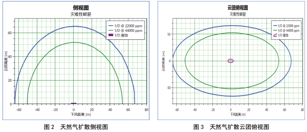管線(xiàn)輸送介質(zhì)為易燃、易爆的天然氣,發(fā)生火災爆炸事故時(shí)產(chǎn)生的沖擊波將對人員、財產(chǎn)、建筑物及大氣環(huán)境產(chǎn)生一定影響。利用PHAST軟件,對可能發(fā)生的泄漏和可能產(chǎn)生的事故進(jìn)行定量分析。以管道完全破裂下的天然氣擴散、爆炸輻射熱半徑和超壓強度半徑進(jìn)行分析,如圖2-5所示。