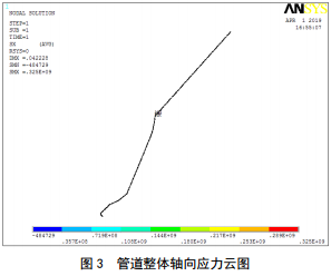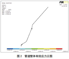 以 高 陡 邊 坡 滑 坡 區 域 內 管 道 為 對 象 , 利 用ANSYS軟件建立該滑坡段管道應力分析模型,根據現場(chǎng)勘察數據對模型施加邊界條件,計算外部荷載作用下管道與焊縫的應力值。經(jīng)計算,管道最大有效應力為335 MPa(圖 2),最大軸向應力為325 MPa(圖 3),應力水平滿(mǎn)足規范要求;提取受滑坡影響區域內環(huán)焊縫的應力值,結果顯示滿(mǎn)足規范要求。