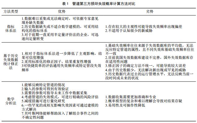 以上三種方法均在一定程度上解決了實(shí)際問(wèn)題,指標體系法簡(jiǎn)單易用但受主觀(guān)影響較大;跉v史數據統計修正法,易用性及復雜程度居中,得到了廣泛認可,但修正因子方法的確定不統一限制了進(jìn)一步發(fā)展。數學(xué)分析法能夠解決不同失效模式的失效問(wèn)題,能應用于更精確的風(fēng)險評估,但模型復雜難以理解,可操作性低。三種方法的對比及優(yōu)缺點(diǎn)如表1所示。