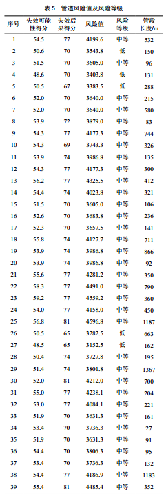 (6)各管段風(fēng)險等級確定。根據各管段失效可能性和失效后果計算出失效風(fēng)險值,再依據分級準則進(jìn)行風(fēng)險等級確定。