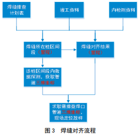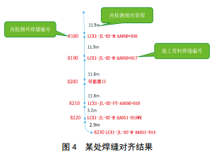以往焊縫定位主要依據竣工資料或內檢測數據[1],數據來(lái)源單一,數據質(zhì)量無(wú)法保證,焊縫定位的準確性差,環(huán)焊縫排查工期會(huì )受到影響。 2019年分公司共開(kāi)展環(huán)焊縫排查500處,邀請第三方技術(shù)服務(wù)公司依據管道運行期復測數據、內外檢測數據和竣工資料(管道施工記錄、焊縫竣工測量成果表)等數據進(jìn)行三個(gè)維度的數據對齊和相互驗證,從而大大提高了焊縫定位精度,提高了焊縫排查的效率,縮短了整體工期。某處焊縫排查的對齊流程和結果如圖 3、圖 4所示。