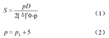 式 中S 為 卡 具 壁 厚 ( 實(shí) 際 應 用 中 不 應 小 于 6mm), mm; p 為卡具設計壓力, MPa; D 為卡具直徑(注劑式卡具為管道本體外徑+2倍注劑厚度),mm; φ 卡具接頭系數; pL為泄漏介質(zhì)最高壓力,MPa; [δ]t為卡具材料的許用應力(泄漏介質(zhì)溫度下), MPa。