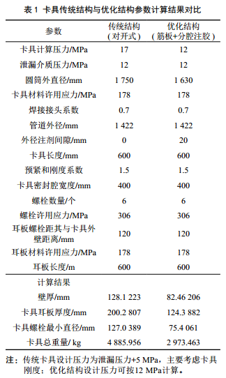 以管徑D1 422 mm、壓力12 MPa、卡具材料16 MnⅢ為例,分別按照傳統結構和優(yōu)化結構進(jìn)行參數計算,結果見(jiàn)表 1。
