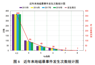 地磁擾動(dòng)的強度與太陽(yáng)風(fēng)的等離子體強度密切相關(guān),對于管道來(lái)說(shuō)另一個(gè)重要的影響因素就是土壤電阻率的變化程度。其波形圖其實(shí)是無(wú)固定周期的,它沒(méi)有明顯的變化規律,持續時(shí)間為數小時(shí) 到數天。但是地磁暴發(fā)生時(shí),其頻率變化大多落入0.01~0.0 001 Hz的頻率范圍內。 2016年9月1日至2018年11月24日期間,根據中科院國家空間環(huán)境預報中心的數據來(lái)看,共發(fā)生了1次超大磁暴, 3次大磁暴, 24次中磁暴, 61次小磁暴。隨著(zhù)太陽(yáng)活動(dòng)進(jìn)入新的活躍周期,近三年地磁暴發(fā)生的頻率和等級都維持在一個(gè)比較高的水平,如圖 6所示。