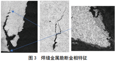 裂紋起裂區域(打底焊)呈現局部塑性起裂;沿焊縫金屬的裂紋擴展均為脆性擴展,截面金相可見(jiàn)脆性二次裂紋(圖 3);內外壁及斷口均未發(fā)現明顯的腐蝕痕跡。