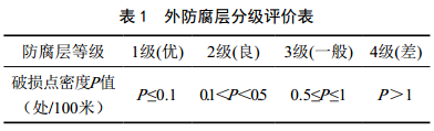 站場(chǎng)管道長(cháng)度短、支管多、管道接地點(diǎn)密集,施加的電流信號通過(guò)接地體流入整個(gè)管道和接地系統,導致管道在某些位置出現電流疊加,因此不能按照電流衰減來(lái)計算防腐層整體質(zhì)量,對于采用三層聚乙烯復合結構防腐層的埋地管道,可以根據表 1對埋地管道外防腐層進(jìn)行分級評價(jià)[4]。