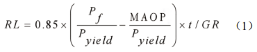 式中RL 腐蝕壽命, a年; C 年校正系數; P f計算失效壓力, MPa; MAOP最大允許工作壓力, MPa;Pyield屈服壓力, MPa; GR腐蝕速率, mm/a); t名義壁厚, mm。
