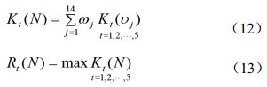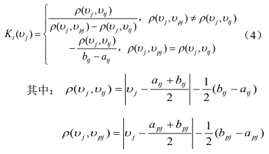 可拓理論引進(jìn)距的概念來(lái)確定關(guān)聯(lián)度,從而將實(shí)變函數點(diǎn)與量值范圍之間的關(guān)系由“類(lèi)內為同”拓展為“類(lèi)內存異”。域內任意一點(diǎn)υj與經(jīng)典域<atj, btj>和節域<apj, bpj>的關(guān)聯(lián)函數Kt(υj)見(jiàn)式(4)。