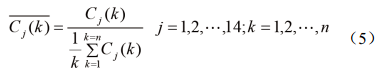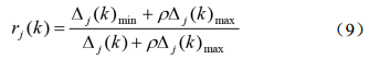 比較數列Cj(k)與參考數列C0(k)的關(guān)聯(lián)系數rj(k)表示為: