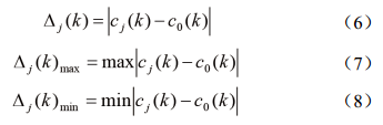 選取參考數列,記為C0(k ),其他數列與之比較,得到絕差數列∆j(k),并求出∆j(k) max和j(k) min,分別表示如下: