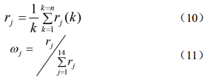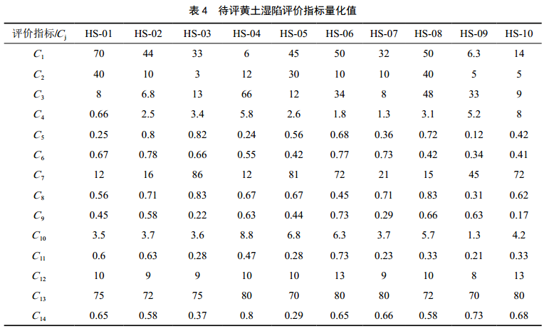 黃土濕陷評價(jià)指標灰色關(guān)聯(lián)度rj由式(10)求得,結果表示為﹛r1, r2,…, r14﹜;利用式(11)計算其權系數ωj。