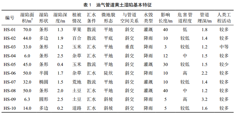 據2019年地質(zhì)災害調查資料,該區域共發(fā)育災害109處,其中黃土濕陷54處,占發(fā)育災害總量的49.54%。隨機選取10處黃土濕陷作為研究對象,依據SY/T 6828―2017《油氣管道地質(zhì)災害風(fēng)險管理技術(shù)規范》,對濕陷面積、濕陷形狀、濕陷最大深度、植被情況、匯水條件、微地貌形態(tài)、與管道空間關(guān)系、水毀類(lèi)型、影響長(cháng)度等進(jìn)行調查、測量與定性評判,基本特征見(jiàn)表 1。