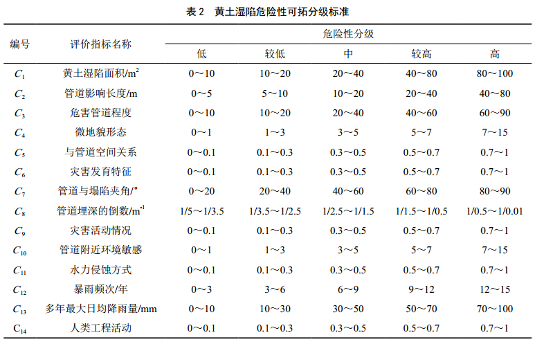 油氣管道黃土濕陷危險性影響因素較多、時(shí)空差異性較大,故參評因子選取是否合理直接影響評價(jià)結果的準確性和實(shí)用性。筆者在野外調查、災害分析和PGRMS應用基礎上,結合已有學(xué)者研究成果,選取黃土濕陷面積(C1)、管道受影響 長(cháng)度(C2)、危害管道程度(C3)、微地貌形態(tài)(C4)、與管道空間關(guān)系(C5)、災害發(fā)育特征(C6)、管道與塌陷夾角(C7)、管道埋深的倒數(C8)、災害活動(dòng)情況(C9)、管道附件環(huán)境敏感性(C10)、水力侵蝕方式(C11)、暴雨頻次/年(C12)、多年最大日均降雨量(C13)、人類(lèi)工程活動(dòng)(C14)等14個(gè)影響因素作為可拓物元模型的評價(jià)指標。