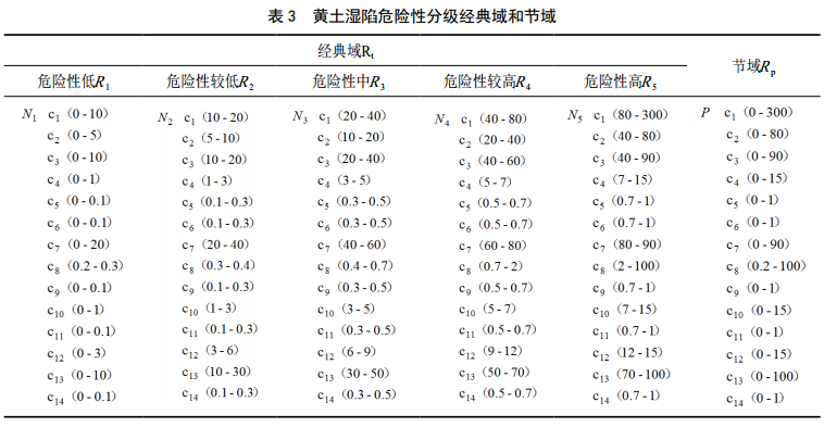 為滿(mǎn)足工程需要,將黃土濕陷危險性劃分為低、較低、中、較高、高5個(gè)等級;依據已有研究及統計成果,其評價(jià)指標可拓分級標準如表 2所示。再據表 2,黃土濕陷危險性分級經(jīng)典域和節域如表 3所示。