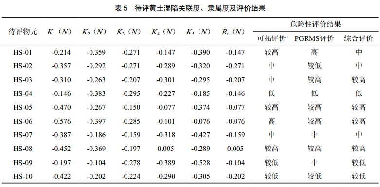 通過(guò)式(4)得待評物元黃土濕陷HS-01~HS-10與風(fēng)險等級j1~j5之間的關(guān)聯(lián)系數K t(υj);結合評價(jià)指標權系數ωj,由式(12)、式(13)計算得待評物元危險性關(guān)聯(lián)度Kt(N )和隸屬度Rt(N ),詳情及其對應的危險性等級見(jiàn)表 5。