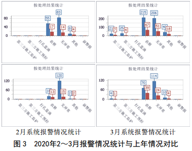 圖 3 (下)為 2020年2~3月疫情封城期間系統報警情況統計,圖 3(上)為上年同期情況,對比發(fā)現總報警數量比上年減少62%、施工報警數量減少91%。