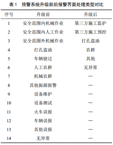 (1)對報警結果進(jìn)行簡(jiǎn)化和分級管理。將最初的14項簡(jiǎn)化為6項;并根據擾動(dòng)方式(機械或者人工)、力度、頻率、次數、持續時(shí)間等后臺數據,將報警分為四個(gè)等級,按照報警等級指派外管道管理員或者巡線(xiàn)工進(jìn)行現場(chǎng)復核(表 1)。