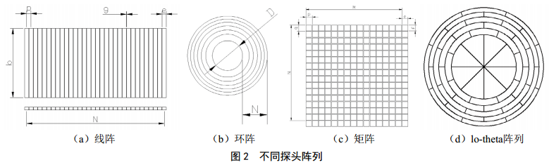 通常將一個(gè)大尺寸的探頭按規則分割成許多獨立小單元探頭的陣列,分為平面陣列和非平面陣列,其中平面陣列又細分為一維陣列(線(xiàn)陣和環(huán)陣)和二維陣列(矩陣和lo-theta陣列),如圖 2所示;非平面陣列主要是指柱面陣列[3]。