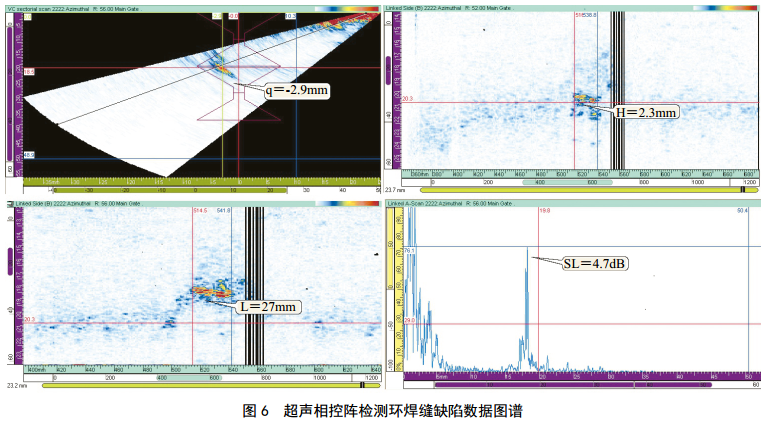 實(shí)際應用中,超聲相控陣檢測的工藝設置、全程掃查記錄等信息,將以多種形式呈現在屏幕上,顯示出各種缺陷供測量、分析。一般設置雙通道來(lái)采集數據, 結合S掃描、 B掃描及A型顯示,對缺陷的位置、深度、長(cháng)度進(jìn)行測量。圖 6所示為某環(huán)焊縫相控陣檢測缺陷數據圖譜,相比射線(xiàn)檢測和常規超聲檢測,數據顯示更加直觀(guān)明了,便于存儲和讀取。