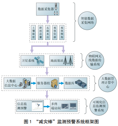 “減災棒”監測預警系統由四個(gè)部分組成:“減災棒”監測系統、無(wú)線(xiàn)數據傳輸系統、大數據管理計算中心、可視化監測預警平臺,如圖 1所示!皽p災棒”是由母樁和子樁組成的監測設備,母樁和子樁按分布式位置構成“減災棒”監測網(wǎng)絡(luò )(圖 2)。無(wú)線(xiàn)數據傳輸系統采用433MHz/GPRS/3G/4G/NB-IoT等多頻段、多中繼冗余交叉組網(wǎng)技術(shù),以確保大數據量長(cháng)時(shí)間穩定工作。大數據管理計算中心依據監測數據進(jìn)行計算并構建了基于機器學(xué)習的決策模型用于智能預警。監測數據和預警信息通過(guò)可視化監測預警平臺直觀(guān)展示。