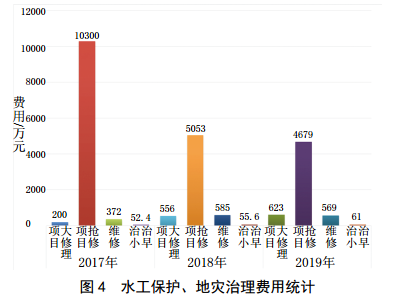 針對地質(zhì)災害數量多、成災頻繁等特點(diǎn),以專(zhuān)業(yè)排查、日常巡查為地災防治的常態(tài)化有效識別機制,對排查、巡查出的地災隱患點(diǎn),開(kāi)展治早治小、工程治理、專(zhuān)業(yè)監測、應急搶險等針對性處置。在汛期由專(zhuān)業(yè)地質(zhì)人員進(jìn)駐管道沿線(xiàn),參與日常巡查,對發(fā)現的地災隱患及時(shí)分析其穩定性、危險性,同時(shí)提出處置措施。據2017年—2019年分公司三年水工保護、地災治理費用統計分析(圖 4),可以看出: