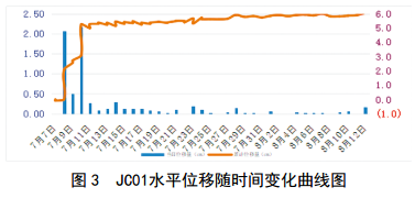7月15日之后(鋼管樁施工完成之后),每日地表位移量很小, JC01、JC03、JC04平均每日位移量分別為0.027 mm、0.027 mm、0.026 mm,每一個(gè)基礎點(diǎn)都相對穩定,沒(méi)有明顯下滑趨勢。說(shuō)明滑坡體位移數據已經(jīng)趨于收斂,滑坡已經(jīng)趨于穩定。