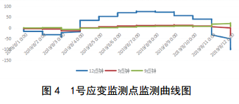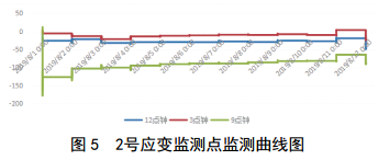 通過(guò)監測數據表明,2019年8月1日后,1號應變監測點(diǎn)和2號應變監測點(diǎn)數據變化不明顯(圖 4、圖 5),各點(diǎn)的整體趨勢基本一致,應變區間為﹣178~78,占極限值的7.73%,未達到關(guān)注級。