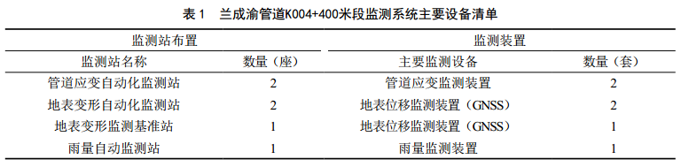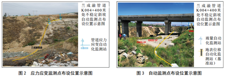 2019年,在甘肅境內管道風(fēng)險較高的不穩定斜坡區域實(shí)地勘察后,在蘭成渝管道K004+400米段選址安裝了地表位移、應力應變、雨量檢測三類(lèi)自動(dòng)化監控設備。結合管道地質(zhì)災害普查對監測工作進(jìn)行現場(chǎng)踏勘和復核,對該處高風(fēng)險不穩定斜坡開(kāi)展實(shí)時(shí)監測。