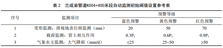 (1)以承災體管道管體的應力應變監測為主,致災體地表位移、雨量監測為輔,綜合判斷管道地質(zhì)災害的發(fā)生及災害情況。