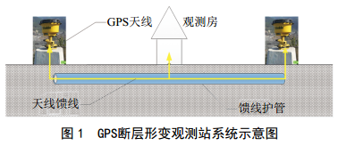 GPS形變監測系統由GPS天線(xiàn)、觀(guān)測房以及天線(xiàn)饋線(xiàn)系統組成,如圖 1所示。