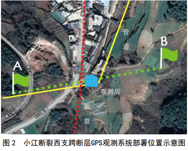 小江西支斷裂帶為南北走向,為了監測該斷裂帶斷裂兩側相對活動(dòng)量,將GPS觀(guān)測站設計為跨斷層監測,地址選在小碑當村南部,管道從西邊過(guò)來(lái)往北轉彎處。