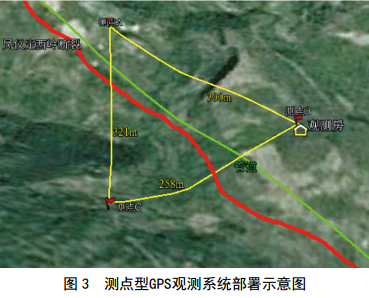 通過(guò)三角形布點(diǎn),可以同時(shí)監測該斷裂帶橫向和縱向的位移數據,在發(fā)生明顯位移或地震時(shí),該系統可以全面提供三個(gè)測點(diǎn)所在的斷層的相對位移情況(圖 3)。