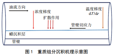 首先需要建立山地管道重質(zhì)組分沉積預測模型。重組分的沉積過(guò)程是多種機理混合作用的結果,其中分子擴散、油流剪切和老化作用對輸油管道中重組分沉積層的形成有較大影響,重質(zhì)組分沉積的物理模型如圖 1所示。