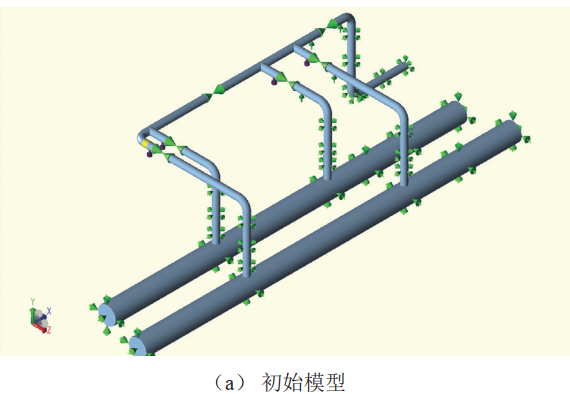 CAESAR Ⅱ軟件是美國COADE公司開(kāi)發(fā)的管道應力分析專(zhuān)業(yè)軟件,是以梁?jiǎn)卧P蜑榛A的有限元分析軟件[3]。應力分析主要步驟為:數據輸入與建模、設定工況、模型檢查、分析計算等。為開(kāi)展管道系統應力分析、彈簧支架初始載荷設置和選型、管道沉降監測提供依據。