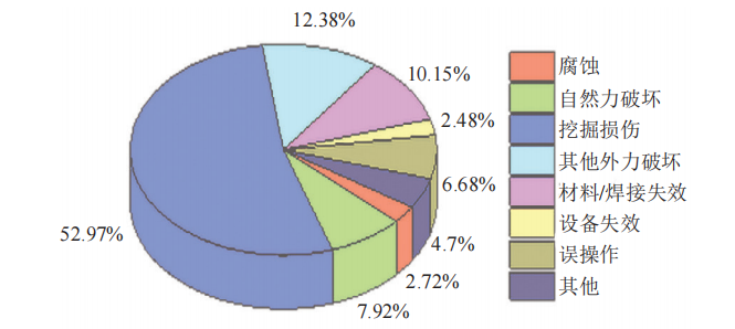 美國油氣管道總里程超過(guò)400萬(wàn)千米,燃氣管道占管道總里程的比例達80%以上。據美國運輸部(DOT)管道和危險物品安全管理局(PHMSA)統計,2010—2018年間發(fā)生燃氣管道本體和焊縫事故共404起,超過(guò)一半(52.97%)事故由挖掘損傷造成(圖 1)。相比之下,因腐蝕導致的燃氣管道事故所占比例(2.72%)低的多,這是因為燃氣管道輸送的介質(zhì)雜質(zhì)含量少,受內腐蝕影響小,另外,相當一部分燃氣管道材質(zhì)為PE管,耐腐蝕性較強。