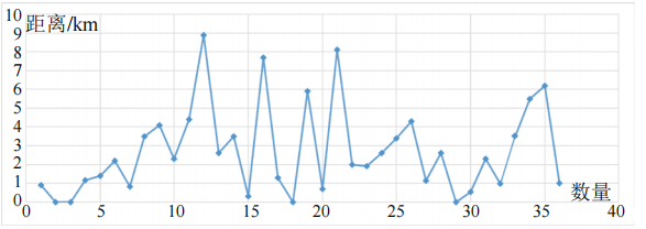 通過(guò)管道所處地理位置分析,從地圖上測量36處管道與最近的城市或鄉鎮中心的最小距離,統計結果如圖 1所示。距離最近的接近0 km,這種情況一般發(fā)生在城鎮處于狹長(cháng)地帶,管道從城鎮中間穿過(guò);距離較遠的達到9 km。分析認為,城鎮規模越大,城鎮化程度較高,管道距離城鎮中心越遠;反之,城鎮規模越小,城鎮化程度較低,管道距離城鎮中心越近。正是管道距離城鎮中心較近情況下,城鎮后期發(fā)展影響管道周邊用地,導致發(fā)生地區等級升級。
