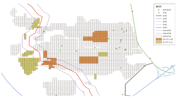從以上分析,可根據管道距離城鎮中心遠近及管道周?chē)擎偦俣葍蓚(gè)因素,來(lái)判斷是否為地區等級升級型高后果區。當管道所處位置距離城鎮中心較近且周?chē)擎偦l(fā)展速度較快,定性判斷為地區等級升級型高后果區。以某管道為例,該管道建設時(shí)期處在城鎮邊緣,地區等級為二級,距離城鎮中心3.2 km。管道周?chē)ㄔO用地年平均擴張0.66  km2,年均擴張率為3.12%,以同心圓形式向外側發(fā)展,使管道位于擴展邊緣,據此定性判斷該處為地區等級升級型高后果區。經(jīng)追蹤觀(guān)察其變化情況(圖 5),后期該區段地區等級由二級地區升級為四級地區,結果與真實(shí)情況符合。