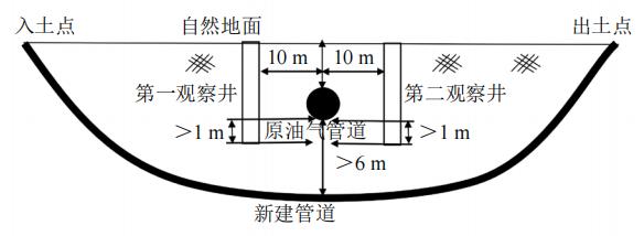新建管道設計中心線(xiàn)方向、與在役油氣管道中心線(xiàn)交叉前、后各10 m位置處開(kāi)挖第一、第二觀(guān)察井,用以驗證定向鉆在穿越在役油氣管道前和穿越后10 m時(shí)的確切深度和位置走向,避免定向鉆在導向時(shí)鉆頭鉆到管體造成損傷甚至發(fā)生事故。觀(guān)察井開(kāi)挖深度不應小于在役管道管底1 m,平行管道方向長(cháng)度至少5 m(圖 4)。