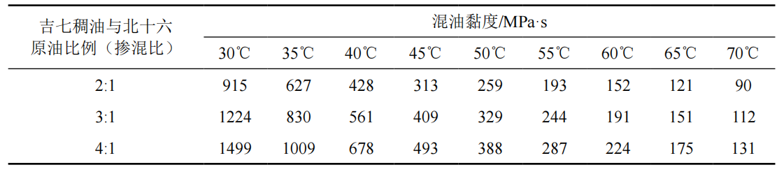 北十六原油和致密油產(chǎn)量趨于穩定,而吉七稠油2018年產(chǎn)量為20×104 t,2020年為31.4×104 t,提高了1.57倍(圖 1)。隨著(zhù)吉七稠油產(chǎn)量增大,導致混油黏度急劇增高(表 3)。