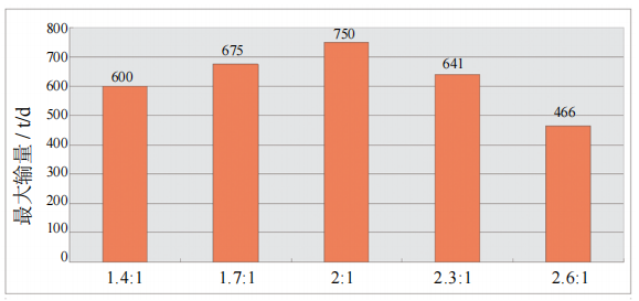外輸管線(xiàn)出站壓力2.5 MPa,進(jìn)站壓力0.12 MPa,出站溫度65℃,地溫3℃,北十六原油和致密油處于穩產(chǎn),產(chǎn)量分別為200 t/d和50 t/d。模擬計算結果表明,現役管道條件下,吉七稠油摻混比為2∶1時(shí),最大輸量達到峰值750 t/d,其中吉七稠油最大混油量為500 t/d;繼續增加吉七稠油摻混比將導致其外輸能力下降(圖 3)。