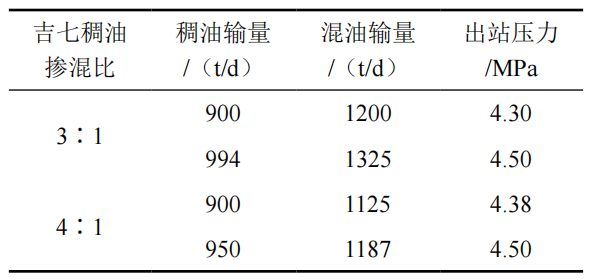 (2)現役管道外輸混油時(shí)吉七稠油最佳摻混比為2:1,出站壓力2.5 MPa,出站溫度65℃,最大混油輸量為750 t/d,其中吉七稠油混油量為500 t/d。