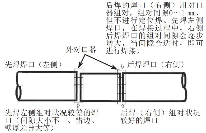 (4)管道組對過(guò)程中出現偏差、錯口、間隙等情況時(shí)不能強力組對,進(jìn)行必要的修磨、調整。