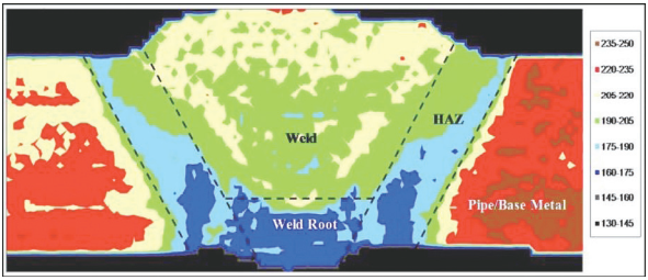 圖 3 使用E6010/E8010 焊條焊接的X70環(huán)焊縫硬度云圖