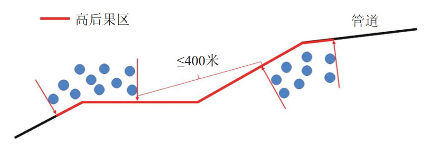 (2)Ⅱ級高后果區。管道兩側200 m范圍內,有大于等于100戶(hù)居民,4層及以上建筑小于2幢,包含最大聚居戶(hù)數;或管徑大于762 mm,并且最大允許操作壓力大于6.9 MPa,輸氣管道潛在影響區域內有特定場(chǎng)所的管段;或除符合Ⅲ級高后果區及本條第一款條件外,管道兩側各200 m內有加油站、油庫等易燃易爆場(chǎng)所的管段。