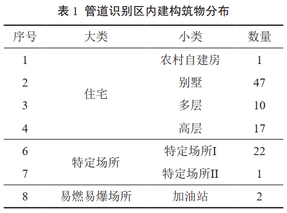 西氣東輸甪寶線(xiàn)昆山高新區和巴城段(KS037-KS54)長(cháng)5.4 km,管道外徑610 mm,壁厚8 mm,管材采用X65鋼,設計壓力4 MPa,運行壓力3.5 MPa,外加三層PE,管道陰極保護為強制電流保護[15]。管道周邊有居民區、工廠(chǎng)、學(xué)校、加油站、高速公路、河流、湖泊等,人口密度較高、交通頻繁。經(jīng)現場(chǎng)核實(shí)確認,得到表 1所示管道識別區內建構筑物分布情況(潛在影響半徑121 m,識別半徑200 m)。