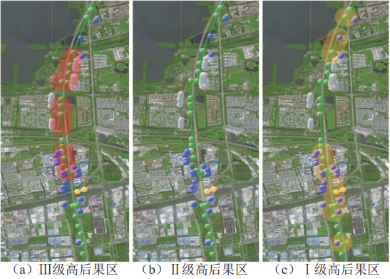 基于python對住宅、特定場(chǎng)所、易燃易爆場(chǎng)所分別進(jìn)行聚類(lèi)、簇合并和等級判定操作(半徑L=200,N=5),利用地圖可視化組件folium得到圖 5所示初步劃分的高后果區識別圖,其中Ⅲ級高后果區3個(gè),Ⅱ級高后果區1個(gè),Ⅰ級高后果區4個(gè)。